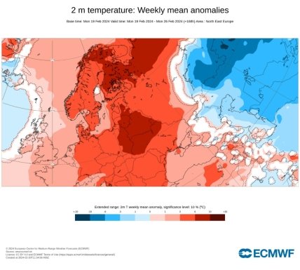 На карте показана средняя аномалия приземной температуры (отклонение от нормы) в Восточной Европе за период с 19 по 26 февраля, данные Европейского центра среднесрочных прогнозов.