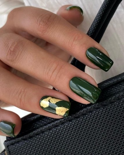 Простий та водночас цікавий варіант — манікюр з фольгою. Саме зелений колір надасть цьому манікюру розкоші та святковості.