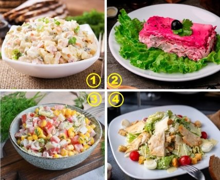Подивіться на картинку і оберіть свій улюблений новорічний салат — Олів’є, Шуба, Крабовий або Цезар.