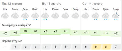 На свято, 14 лютого, очікується хмарна погода та найбільша концентрація дощів зі снігом з-поміж трьох днів. Опади мають розпочатись вранці й протриматись до пізнього вечора. Вдень показники термометрів сягатимуть 3 теплих градусів, а вночі — покажуть +5 °C. У цей день максимальні пориви вітру очікуються вранці та вдень — свіжі 8 м/с.