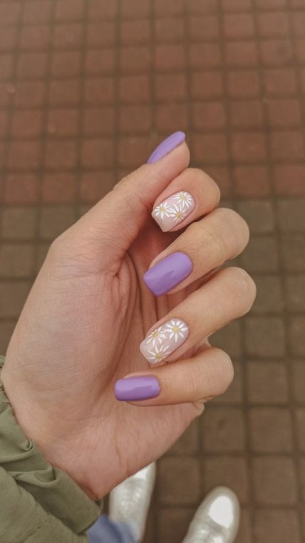 Неймовірно милий манікюр — це ніжно-фіолетовий з немаленькими квітками білого кольору. Так всі погляди точно будуть прикуті до ваших рук.