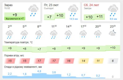 В останню п’ятницю зими очікується сильний дощ з ранку, який до ночі утихне. Повітря прогріється від +7 °C до +9°C. Небо буде затягнуте хмарам протягом усього дня. Вітер сягатиме місцями 17 м\с.