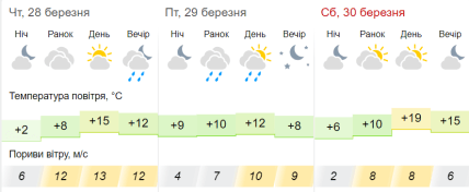 Наступного дня, 29 березня, також очікуються дощі, але йтимуть вже зранку і до настання вечора. У п'ятницю денна температура повітря буде трохи нижча, аніж в попередню добу — 12 градусів тепла. Хоча вночі прогнозується на сім градусів вище — до +9 °C. Найбільші пориви вітру передбачаються у другій половині дня — свіжі-сильні 9-10 м/с.